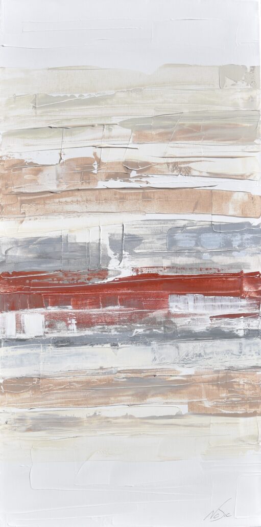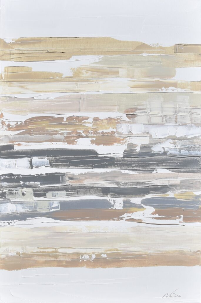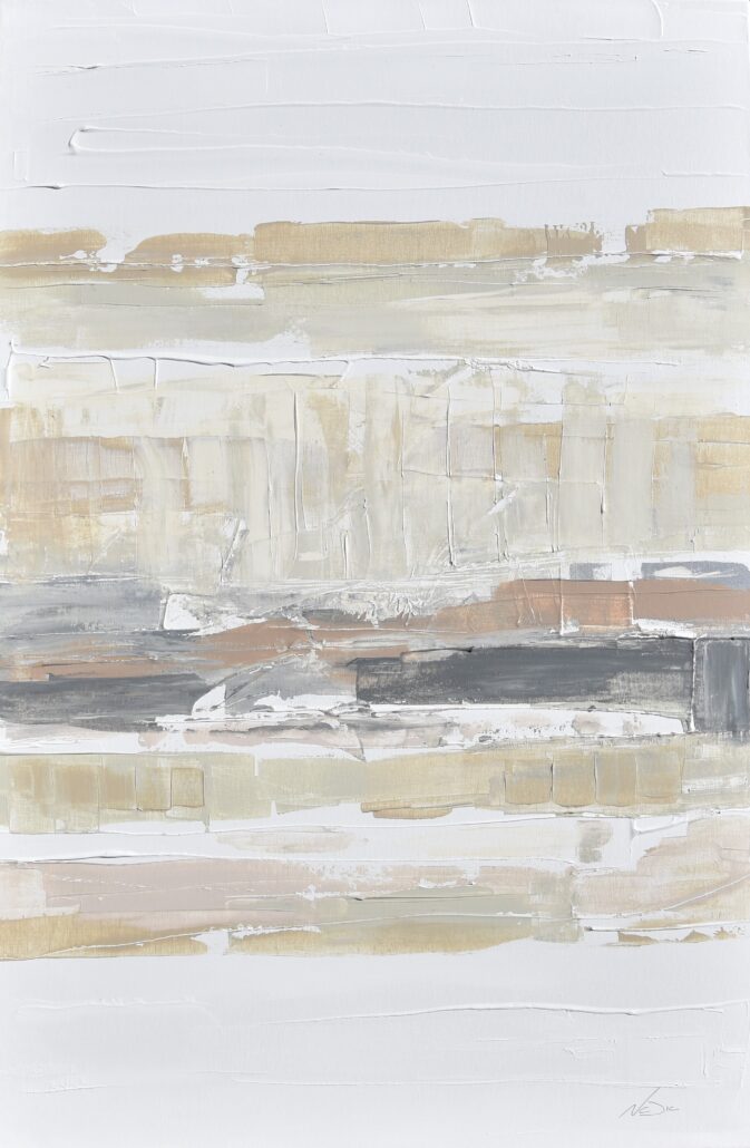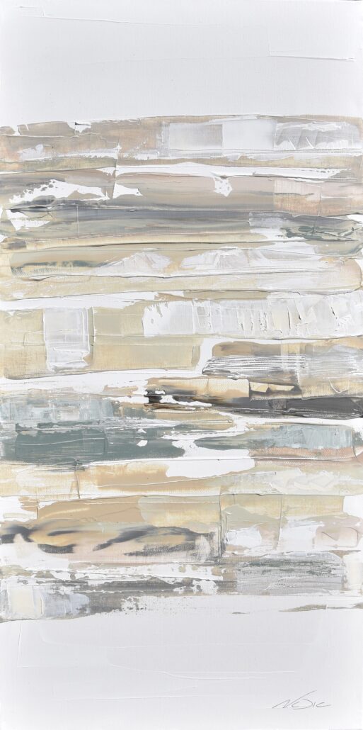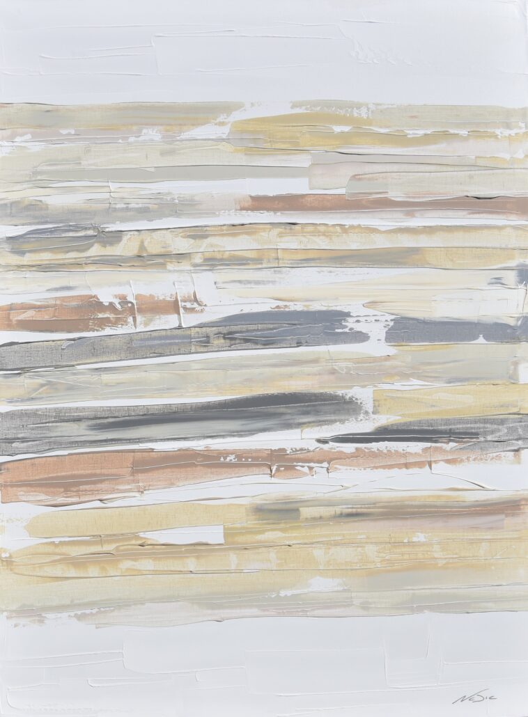 Ces horizons prennent forme avec l’application de traits, principalement horizontaux, superposés avec des jeux de transparence et d’opacité, émergeant toujours d’un univers blanc qui les démarque. Alors, sans être imposé, une suggestion de paysage se dessine à travers une palette de teintes sobres et naturelles, dans des tons principalement de beige.