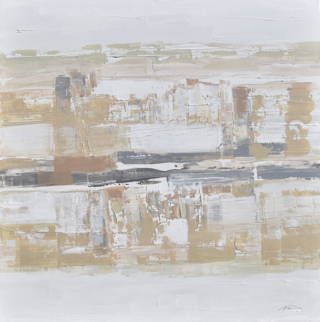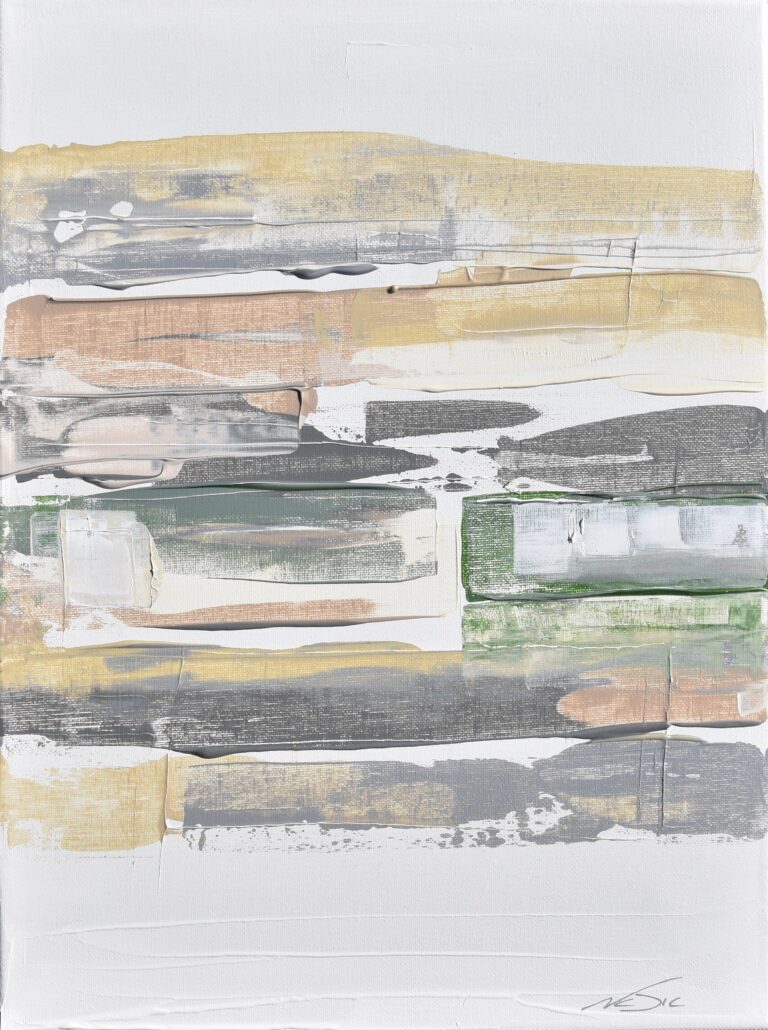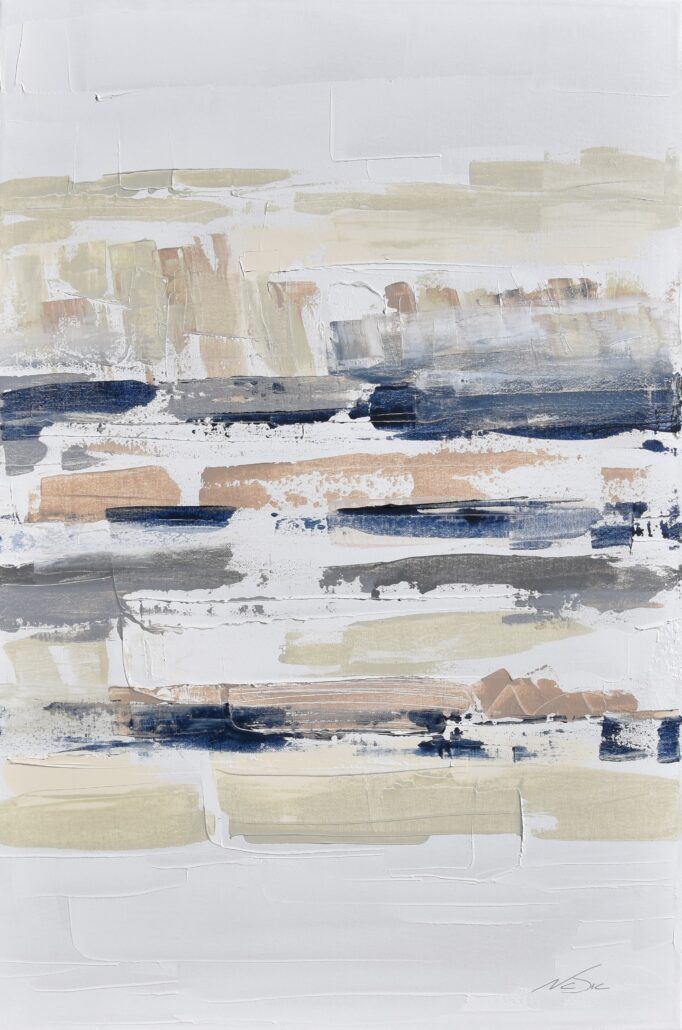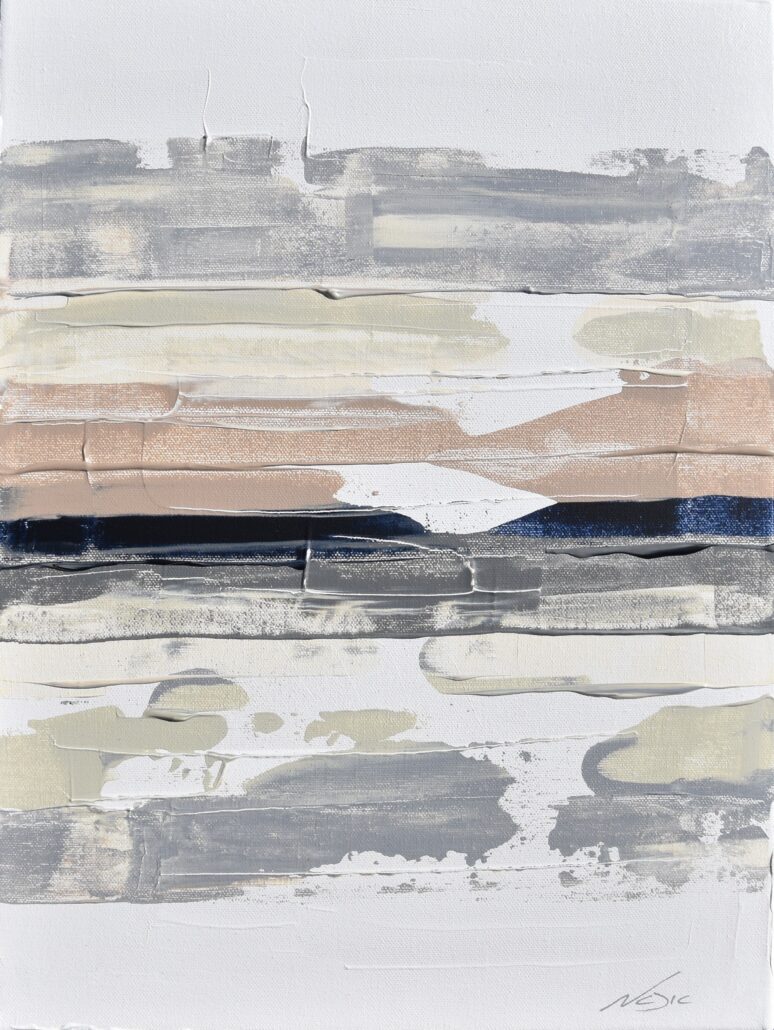 Ces horizons prennent forme avec l’application de traits, principalement horizontaux, superposés avec des jeux de transparence et d’opacité, émergeant toujours d’un univers blanc qui les démarque. Alors, sans être imposé, une suggestion de paysage se dessine à travers une palette de teintes sobres et naturelles, dans des tons principalement de beige.