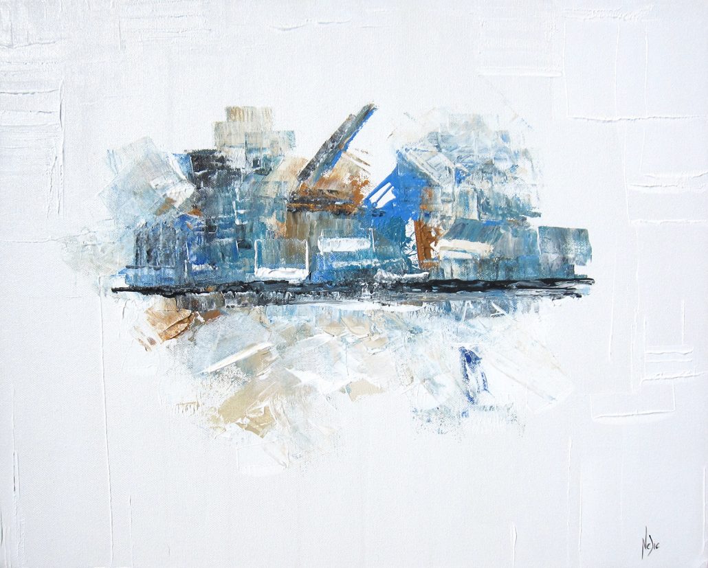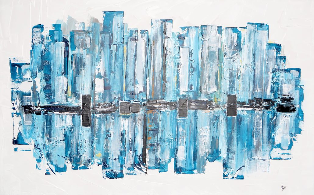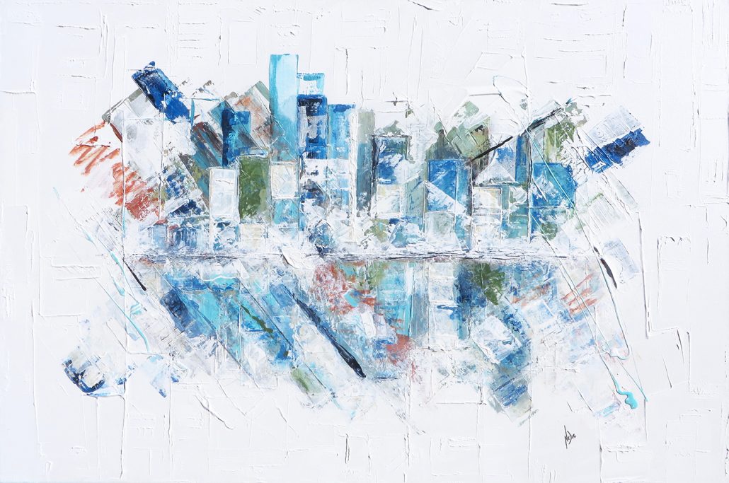 » Point de vue « est une série parallèle à ma série « Composition », elle est réalisée avec le même processus de creation et les mêmes techniques. La composition est cependant plus linéaire et plus planifiée, une ligne horizontale centrale y est peinte pour créer un horizon. Ainsi, l’observateur peut y retrouver un point de vue, un lieu, un paysage d’où l’on peut voir une grande étendue et faire place à la contemplation et à l’évasion.